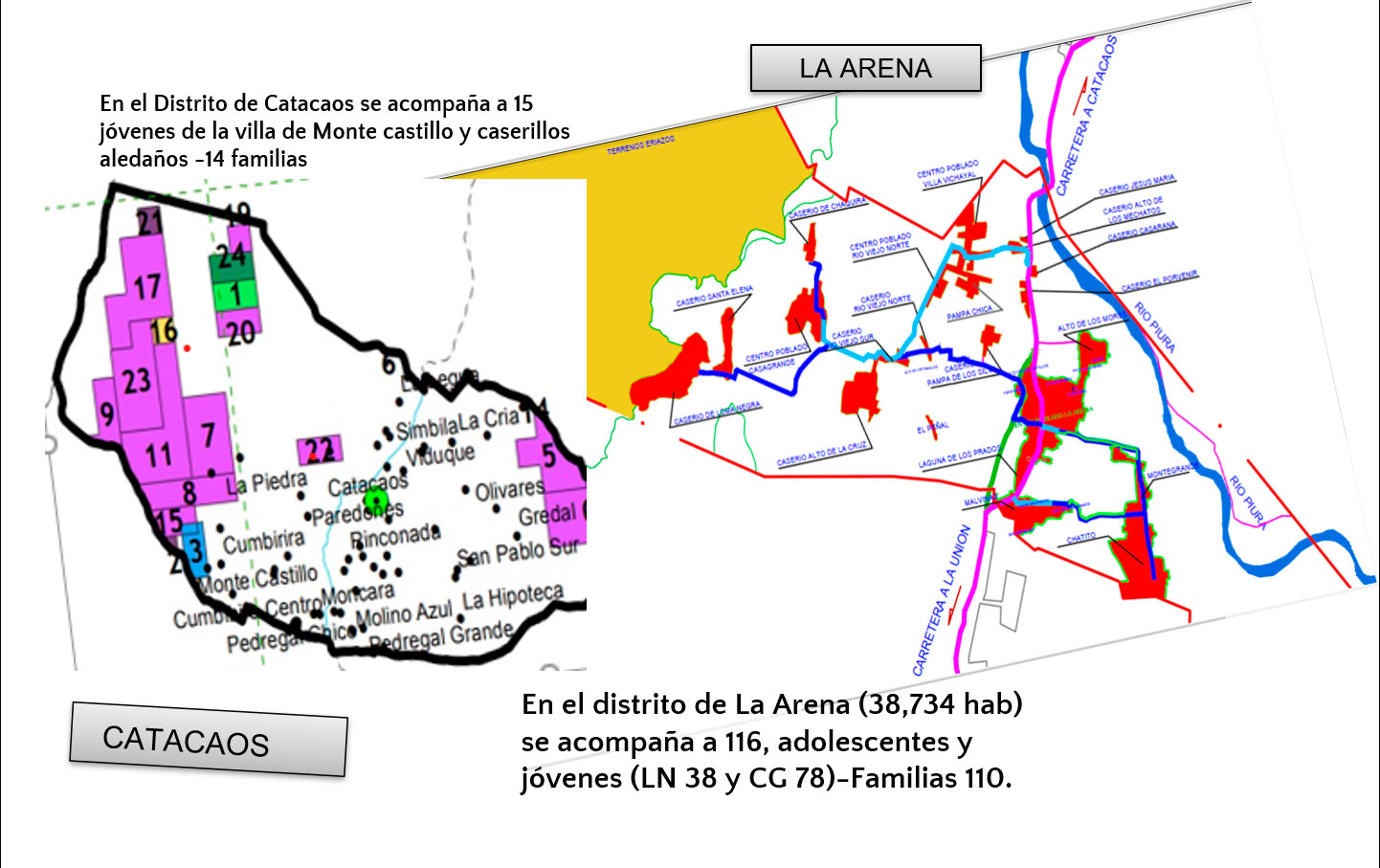 Ubicada al sur de la capital de la provincia de Piura. Ha focalizado su intervención en dos distritos del Bajo Piura: La Arena (dos centros poblados) y Catacaos (cuatro centros poblados), trabaja con familias que se dedican a la pequeña agricultura o como dependientes de las empresas agroexportadoras, en esta zona se trabaja con 174 participantes de 161 familias.
